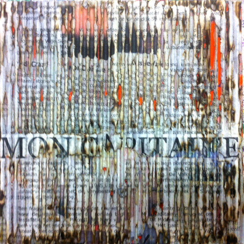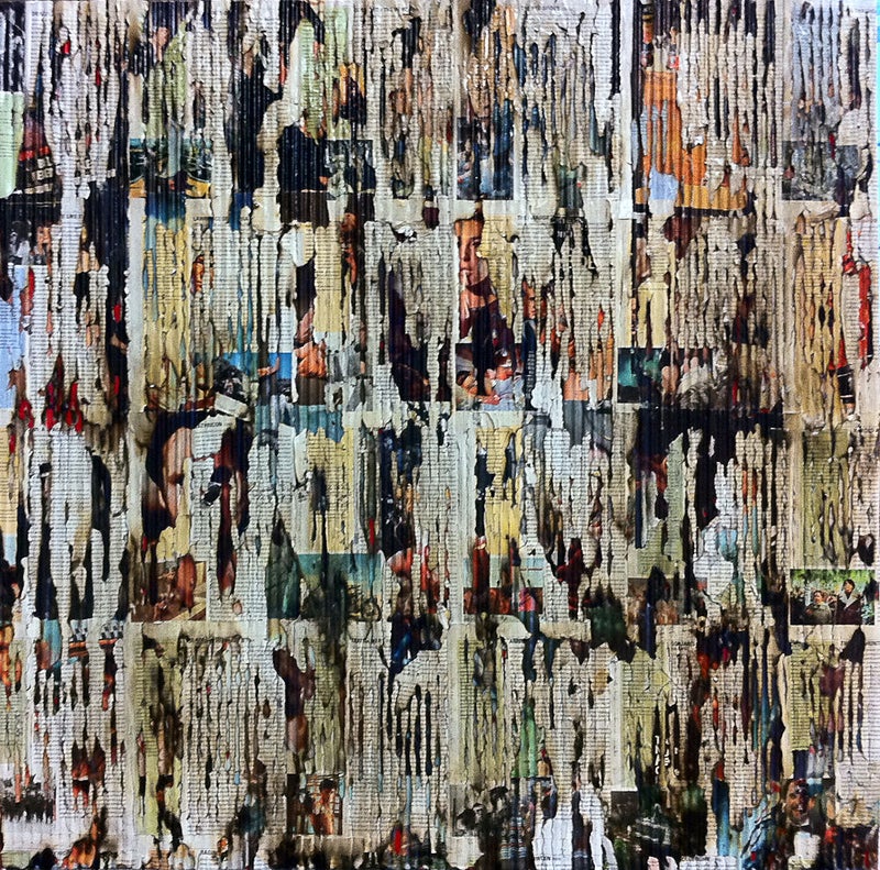 paneel, golfkarton,krantefotos, kranteartikelen, gebrand. 80x80x3 cm 2015