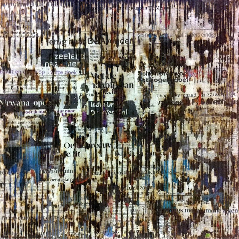 paneel, golfkarton,krantefotos, kranteartikelen, gebrand. 80x80x3 cm 2010