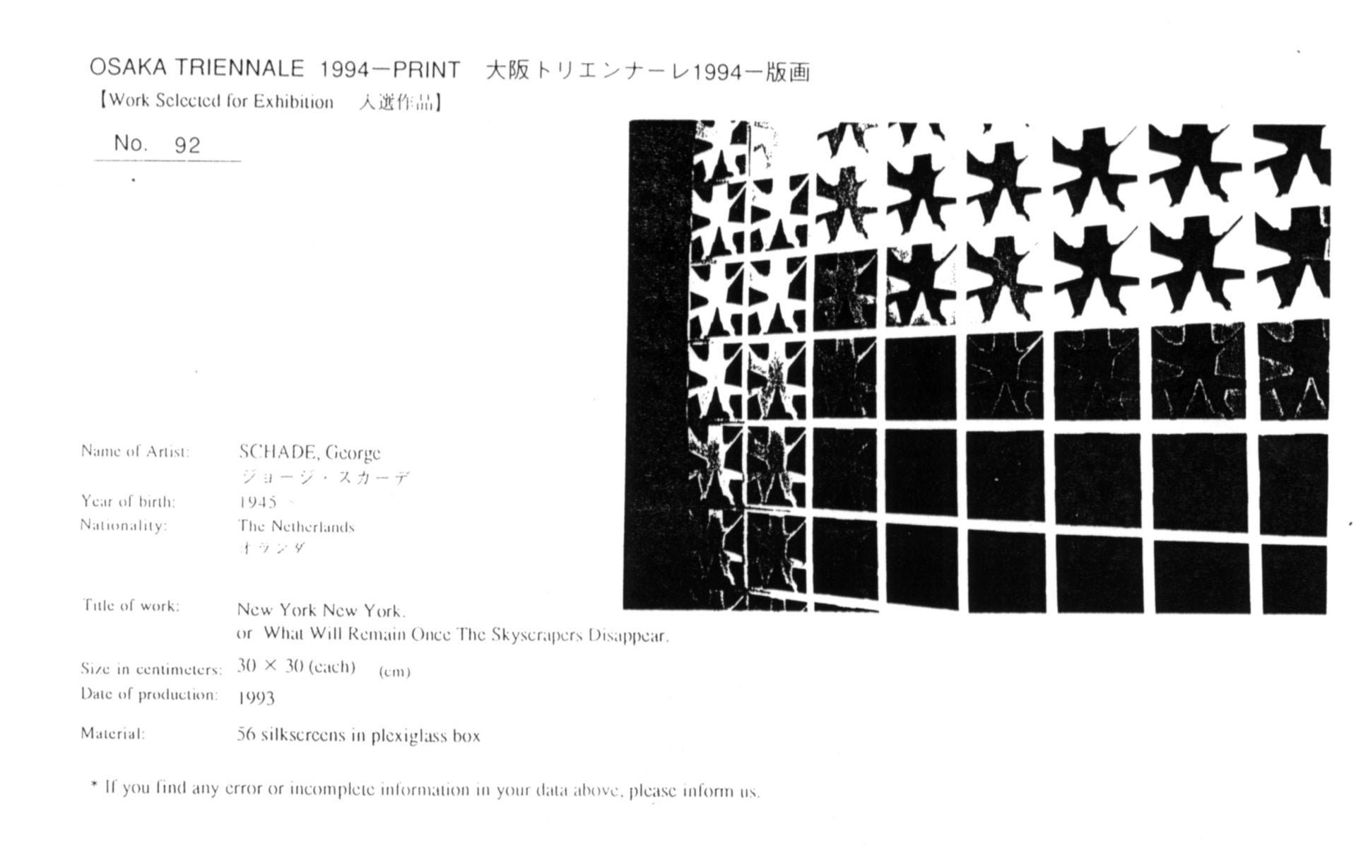 Aankondiging dat aan New York Project tijdens de International Osaka Triënale 1994 de International Somitomo Art Award is toegekend.